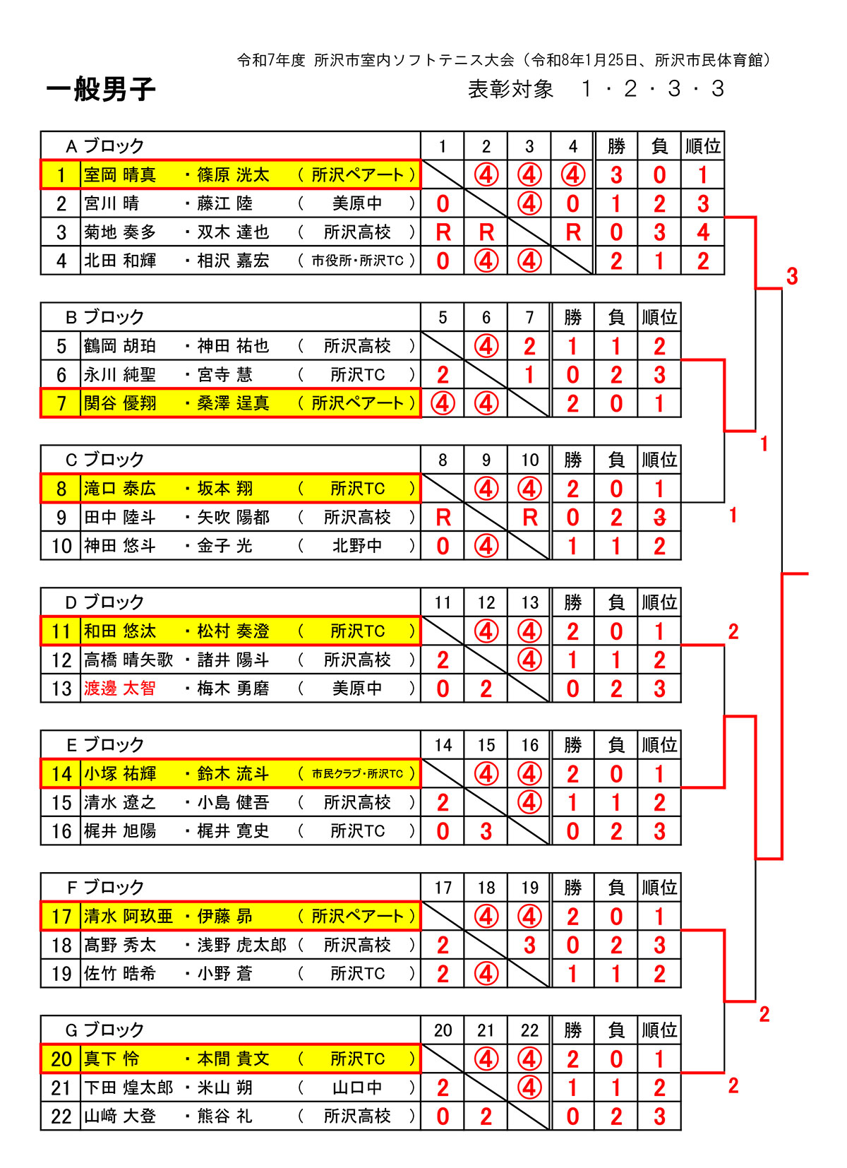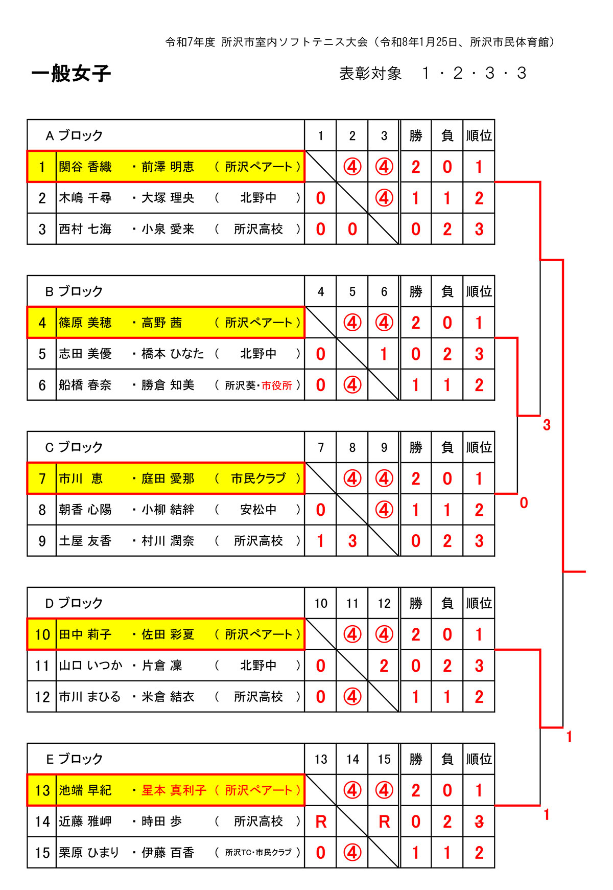 令和7年度所沢市室内ソフトテニス大会が令和8年1月25日(日)、所沢市民体育館メインアリーナにて行われました。各部の入賞者は以下の通り。敬称略。